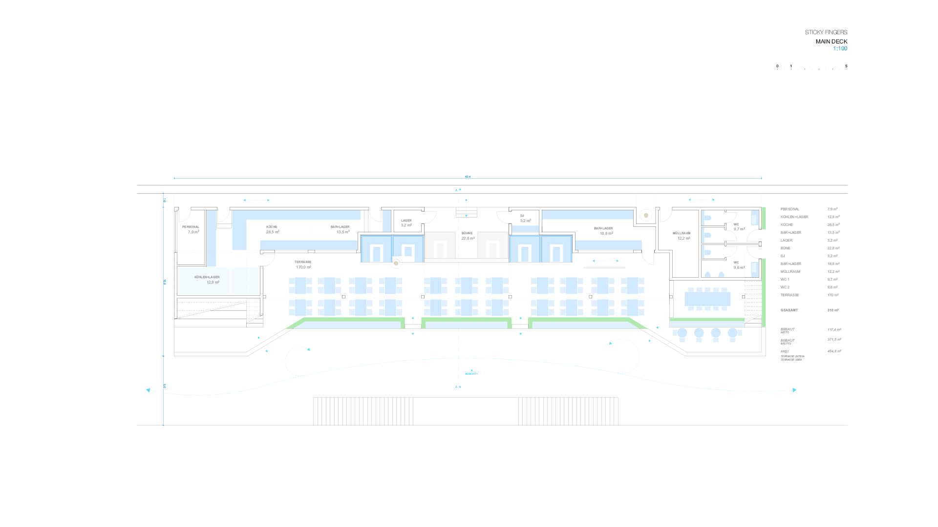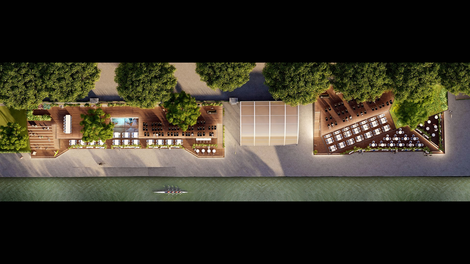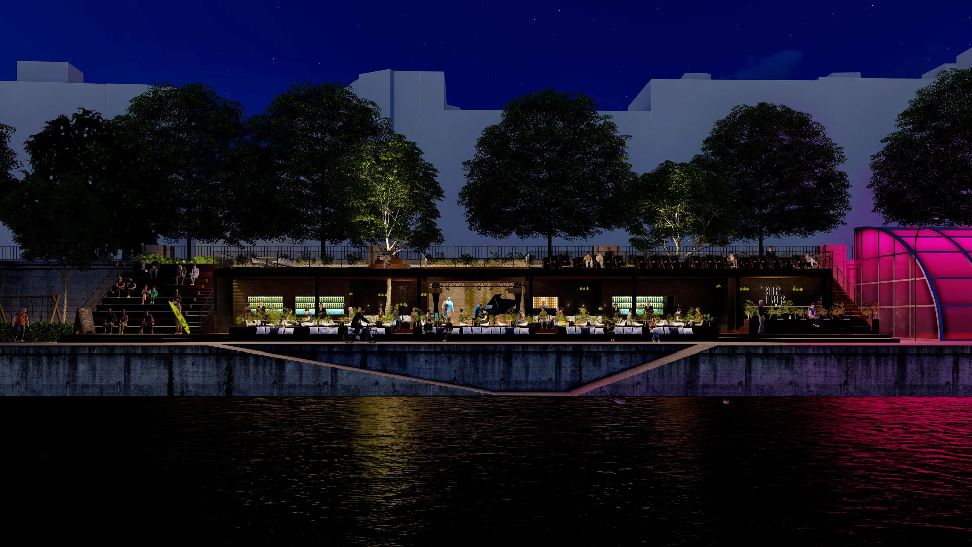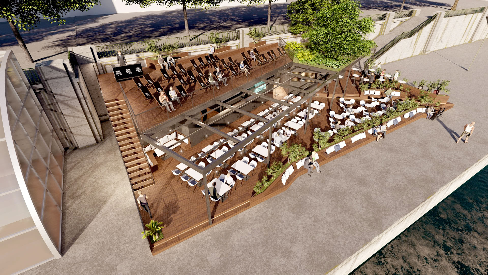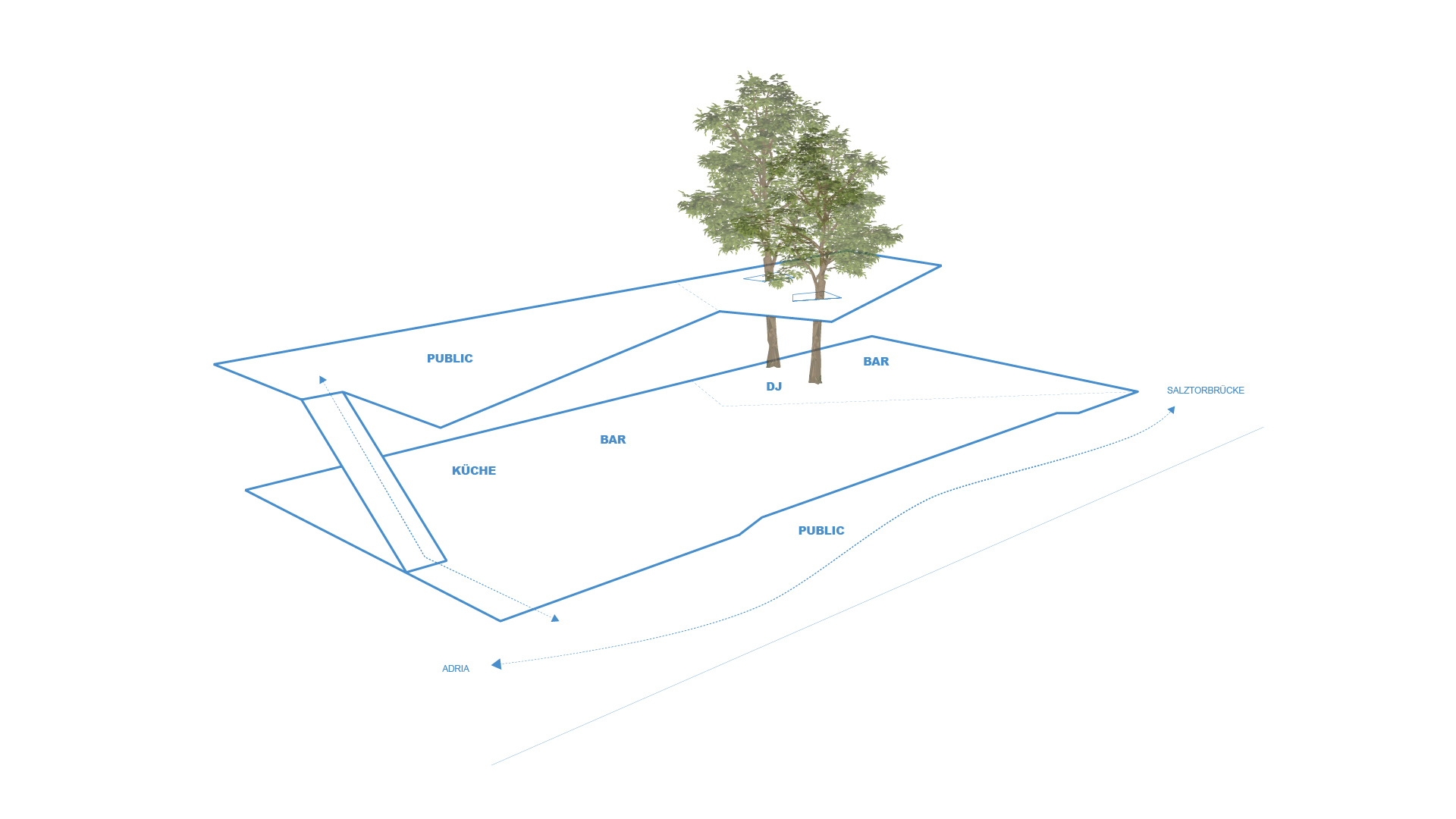 Das Konzept beinhaltet 2 Ebenen welche die bestehenden Bäume mit einbezieht. Auf der unteren Ebene befinden sich der Gastbereich, die Küche, die Bar, sowie die bereits bestehenden Sanitärräume in der Kai-Mauer. Über eine öffentliche Stiege gelangt man auf das Sonnendeck mit welche eine Verlängerung der Promenade darstellt.