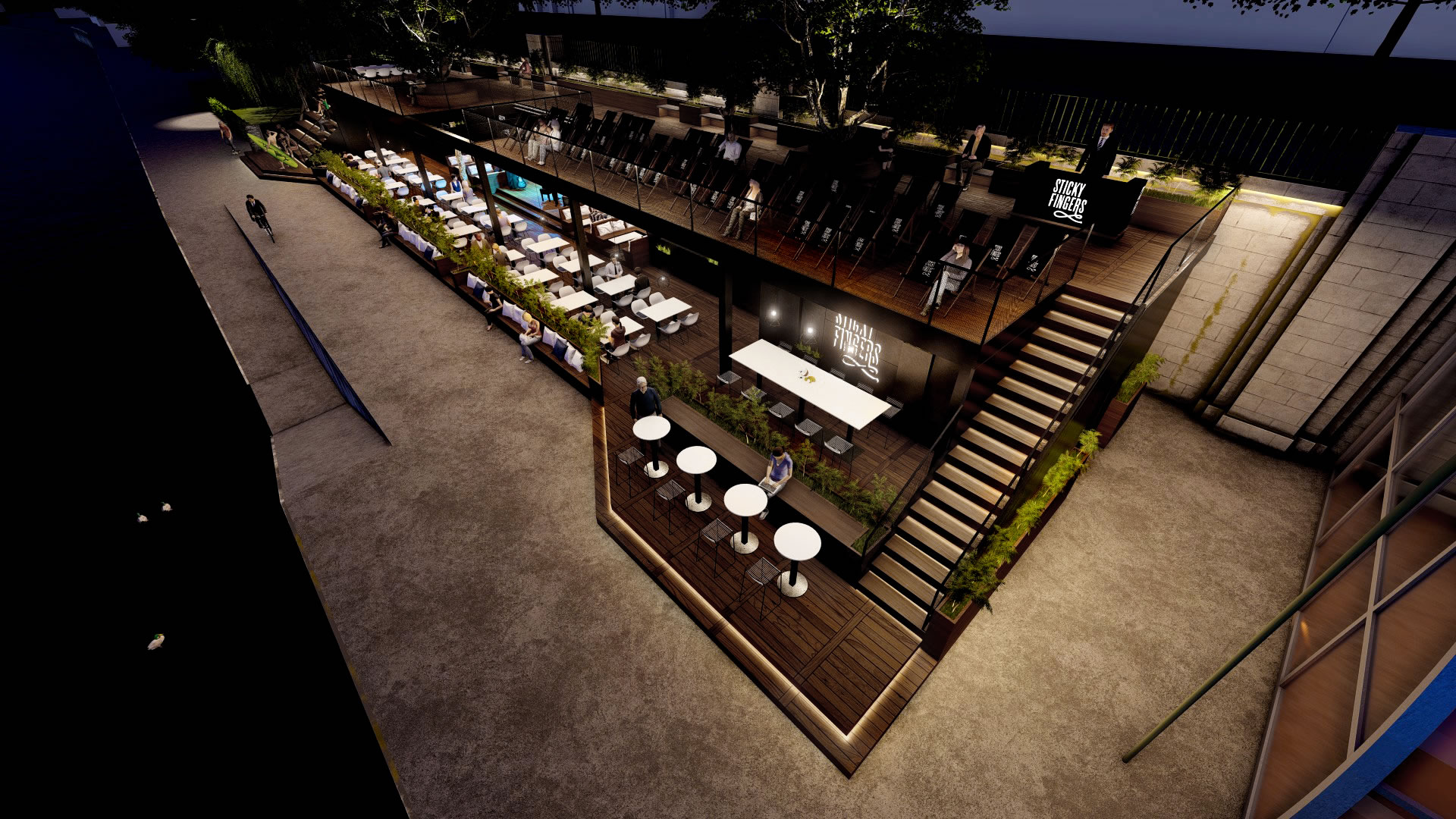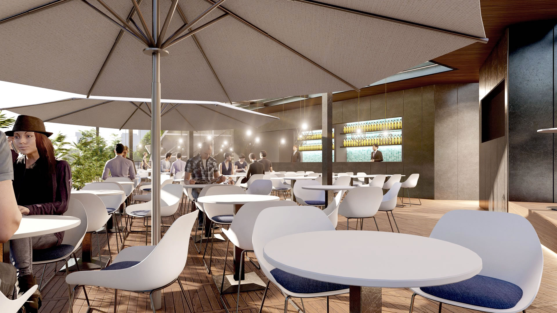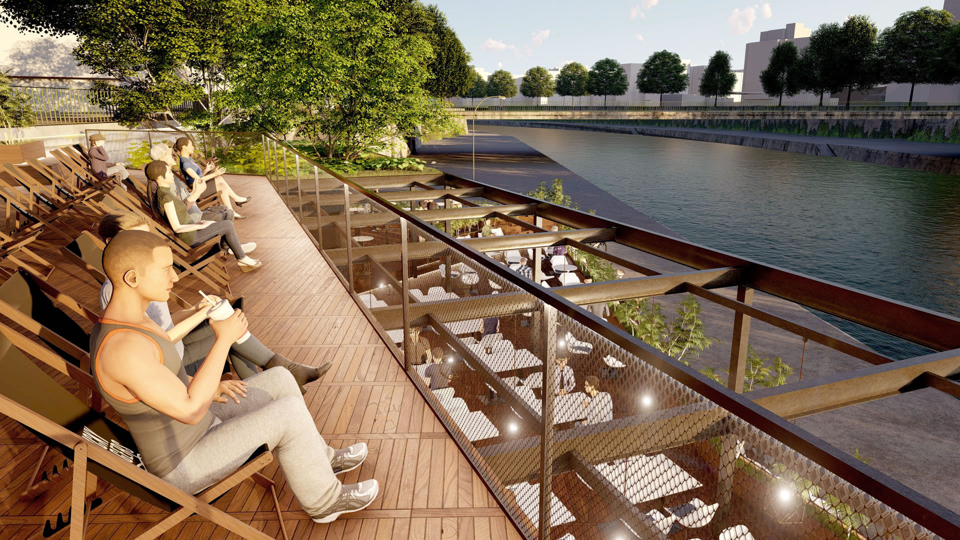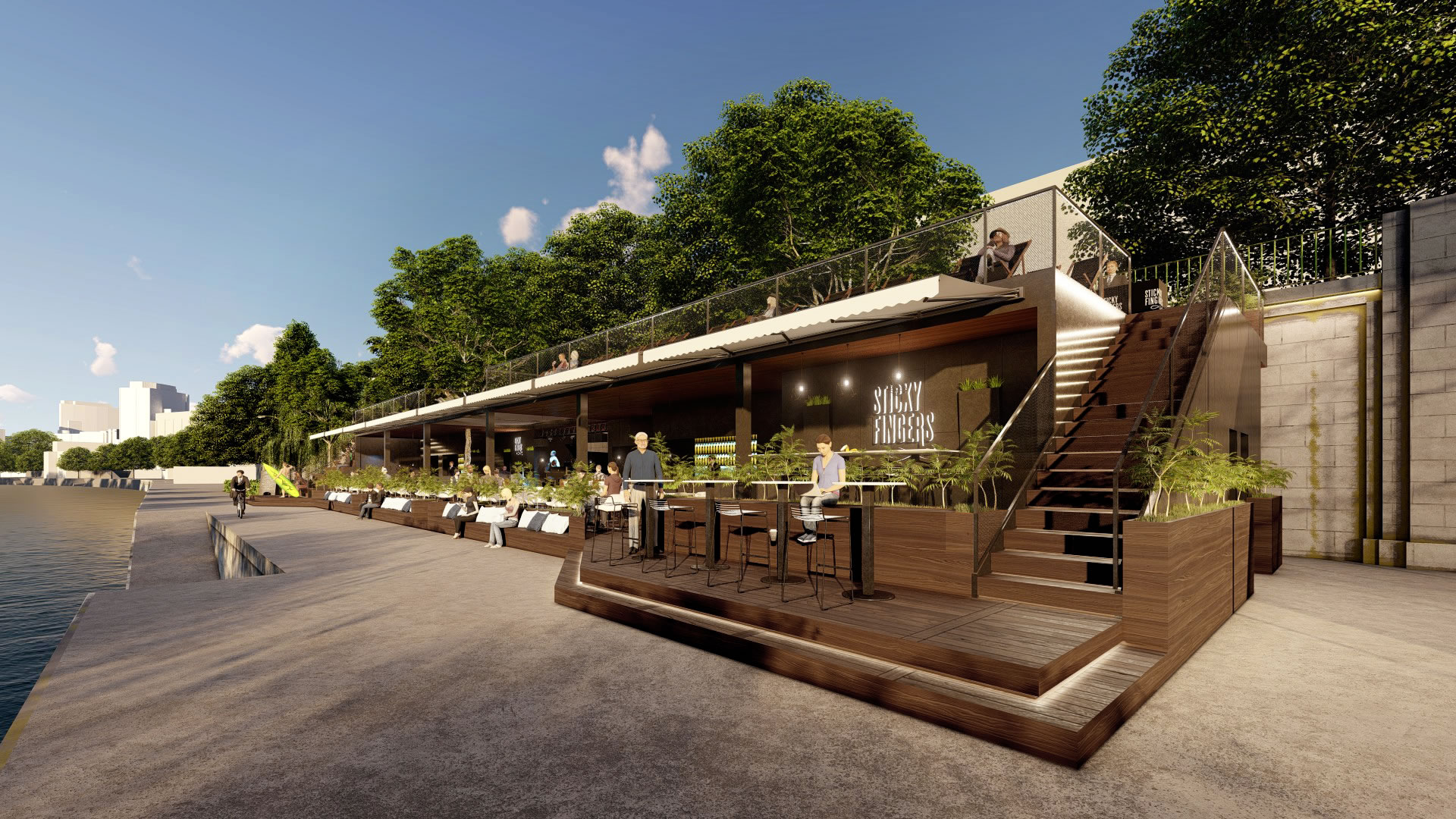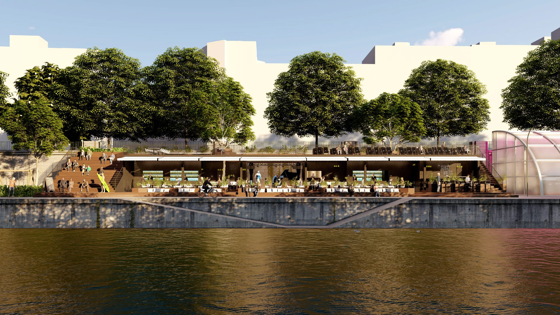 Das Konzept beinhaltet 2 Ebenen welche die bestehenden Bäume mit einbezieht. Auf der unteren Ebene befinden sich der Gastbereich, die Küche, die Bar, sowie die bereits bestehenden Sanitärräume in der Kai-Mauer. Über eine öffentliche Stiege gelangt man auf das Sonnendeck mit welche eine Verlängerung der Promenade darstellt.