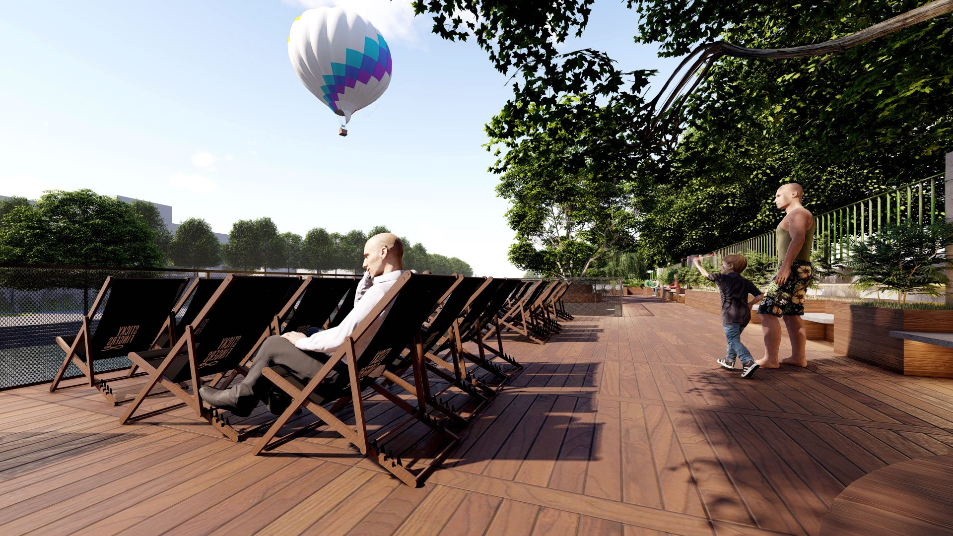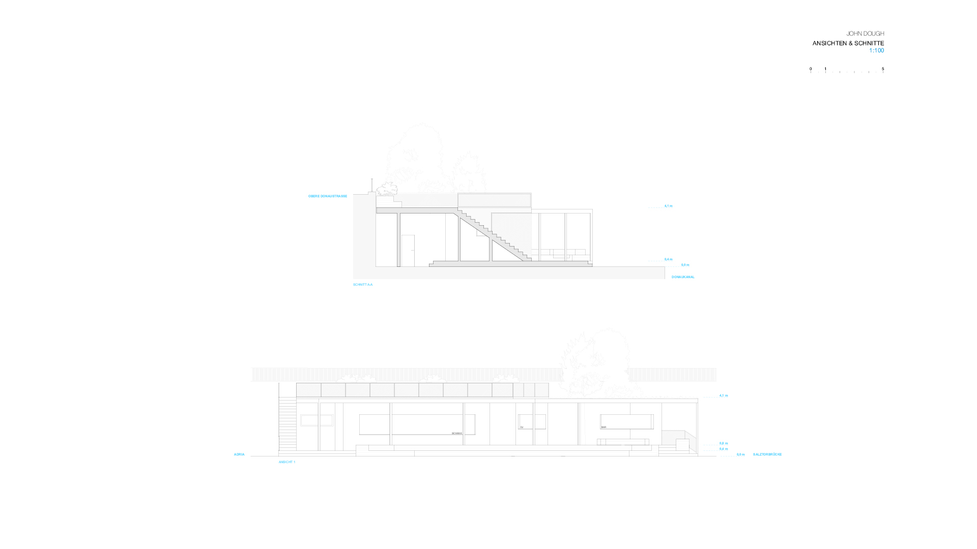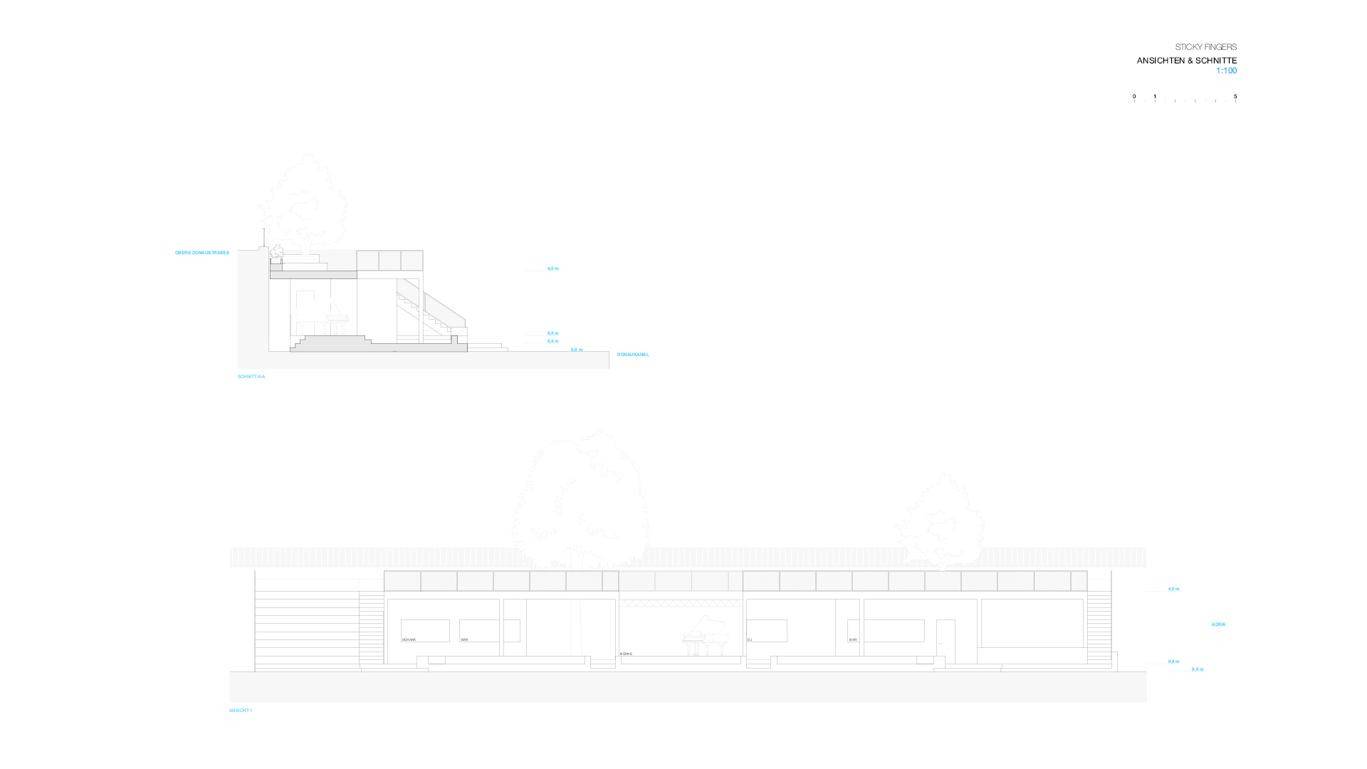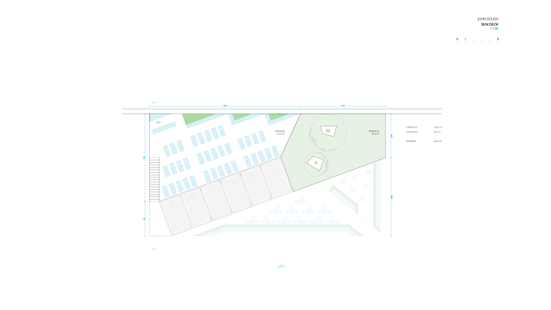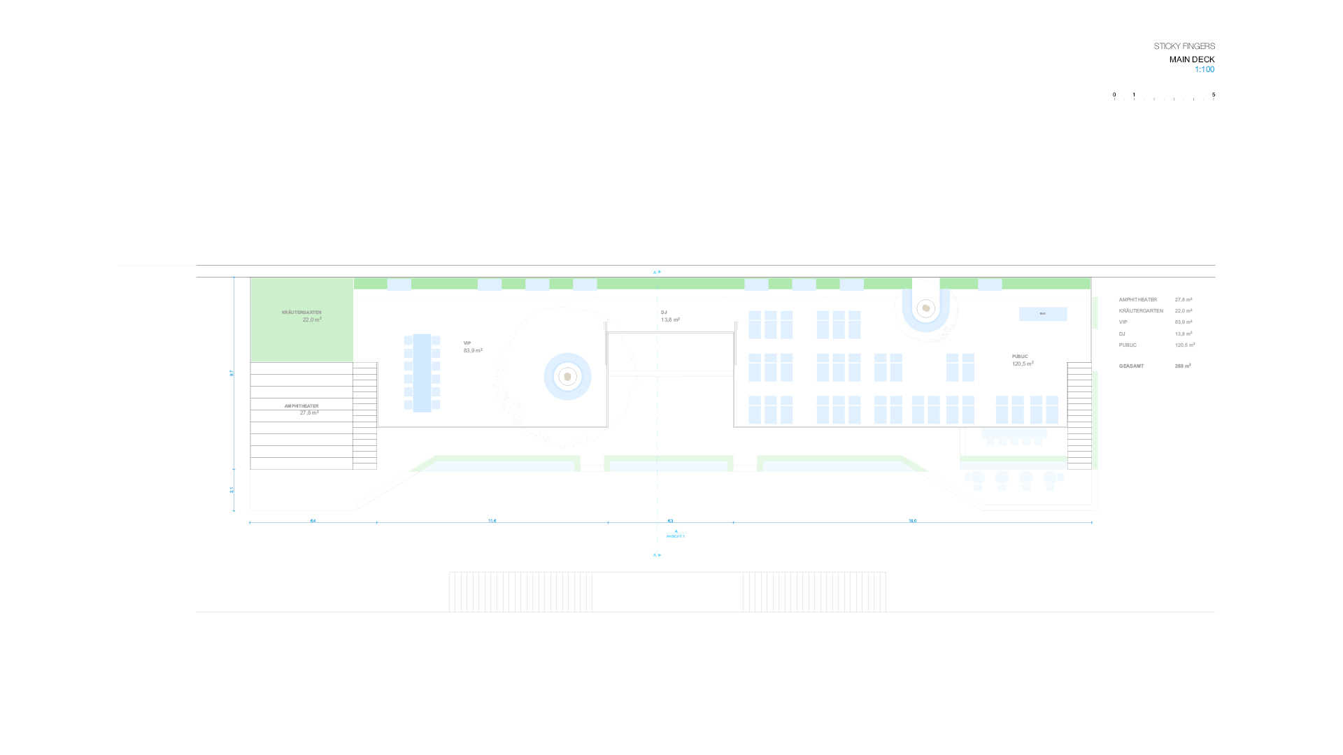Die verlängerung der öffentlichen Promenade erfolgt in unserem Entwurf über das Dach des Lokals. Dieses wird auf der linken Seite mittels einer Amphietreppe und rechts mittels einer Stiege erschlossen. Diese Bereiche sind frei zugänglich und es besteht kein Konsumationszwang.