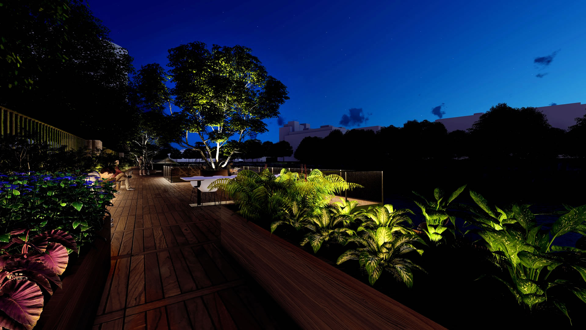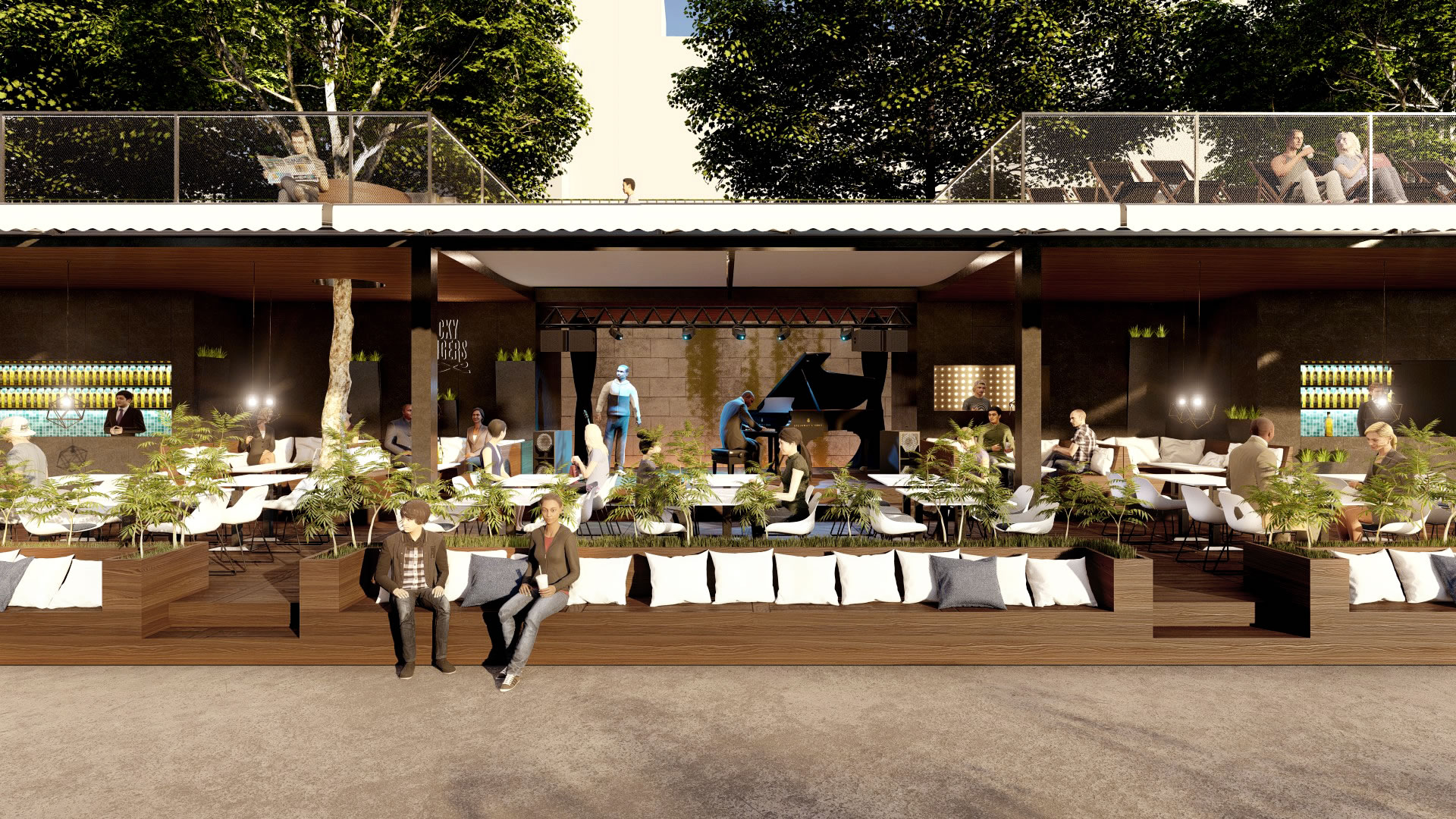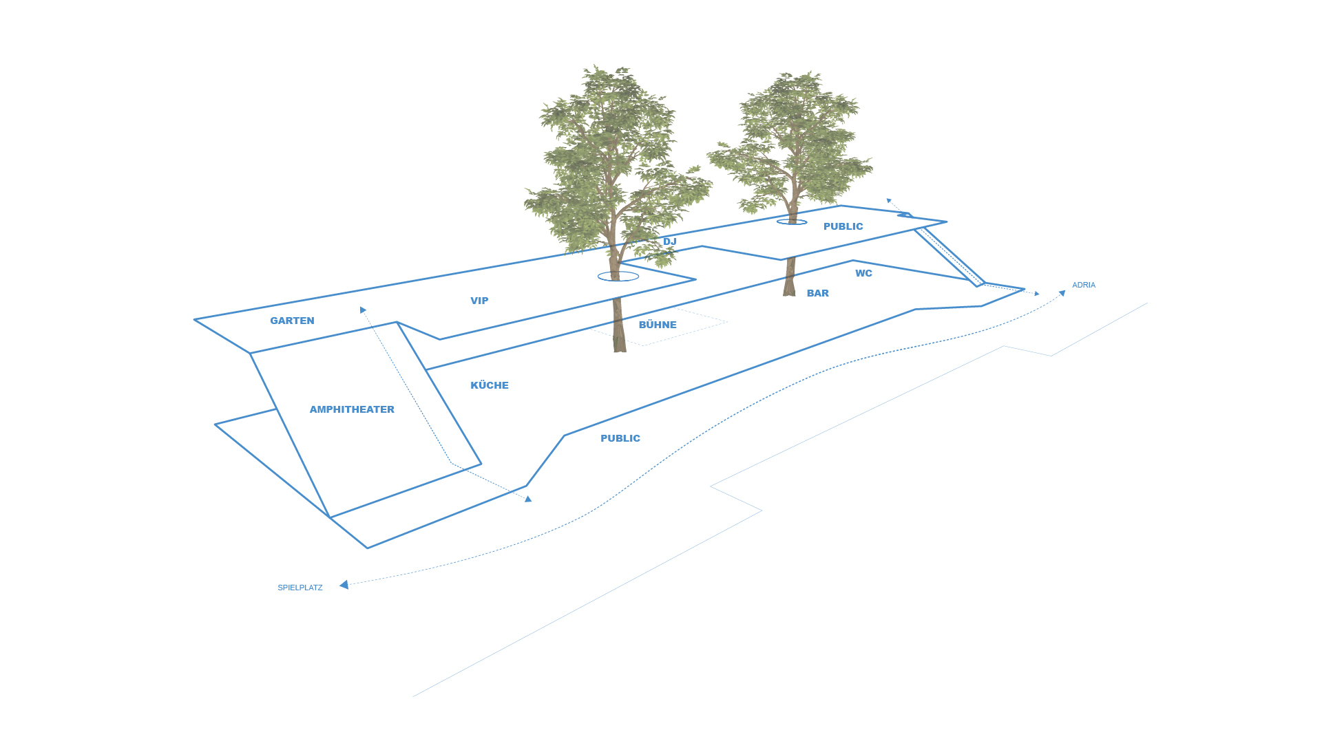 Das Konzept beinhaltet 2 Ebenen welche die bestehenden Bäume mit einbezieht. Auf der unteren Ebene befinden sich der Gastbereich, die Küche, die Bar, die Sanitärräume sowie die Konzertbühne. Über eine Amphietreppe gelangt man auf das öffentliche Sonnendeck mit Kräutergarten welche eine Verlängerung der Promenade darstellt.