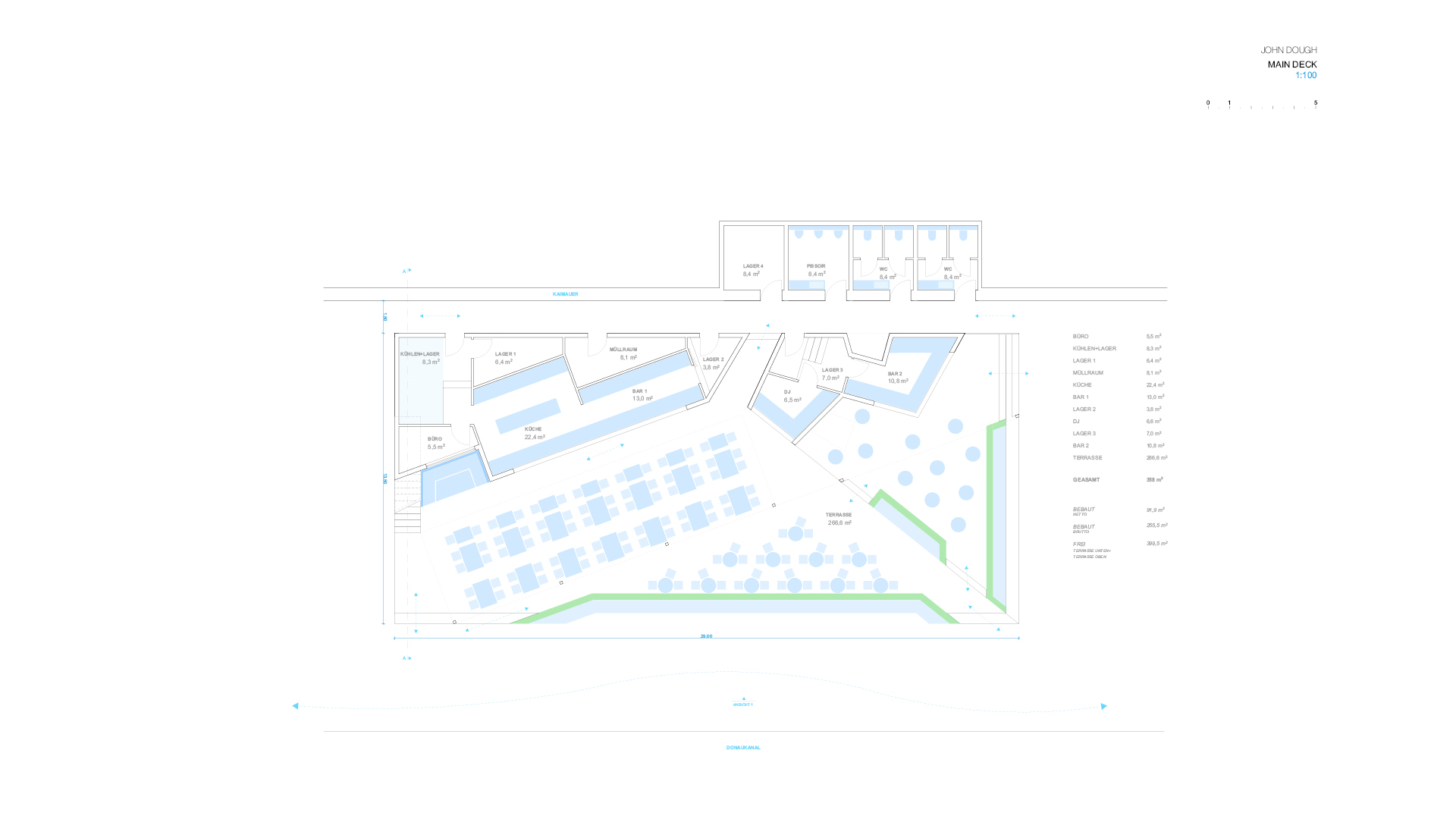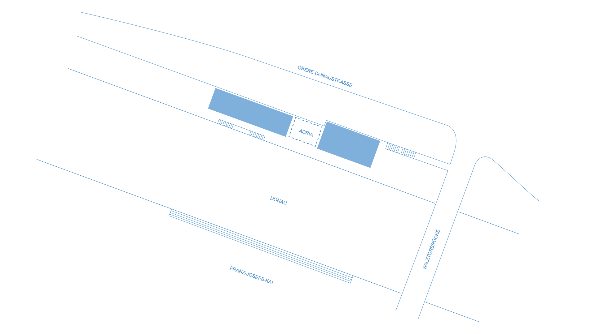Über ca. 90 meter erstreckt sich das Areal am Donaukanal neben der Salztorbrücke. Geteilt wird die Fläche durch das Glashaus der Adria. Wir haben versucht trotz der Teilung durch das Glashaus, das Architektonische Konzept durchzuziehen um ein einheitliches Gesamtbild zu schaffen. Beide Teile benutzen die selben Oberflächen und Materialien.