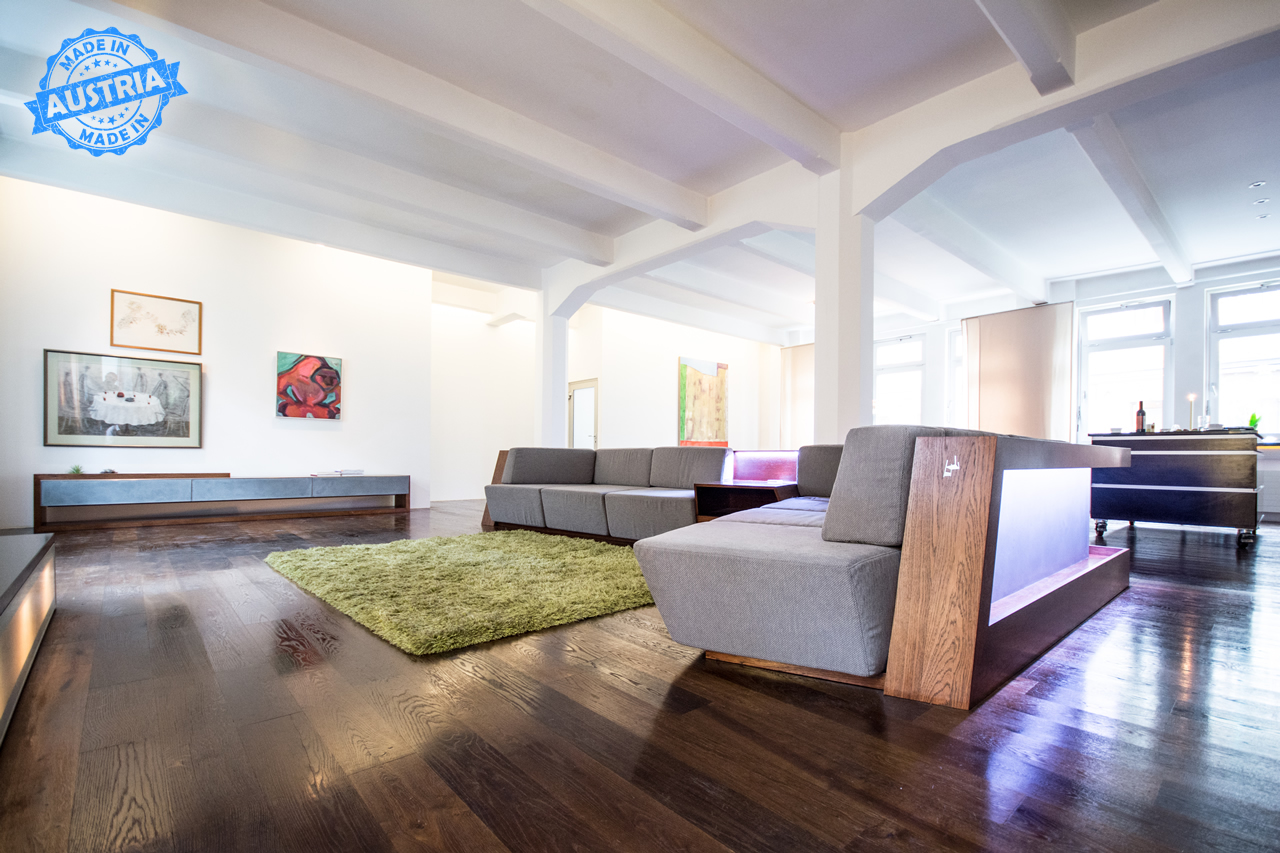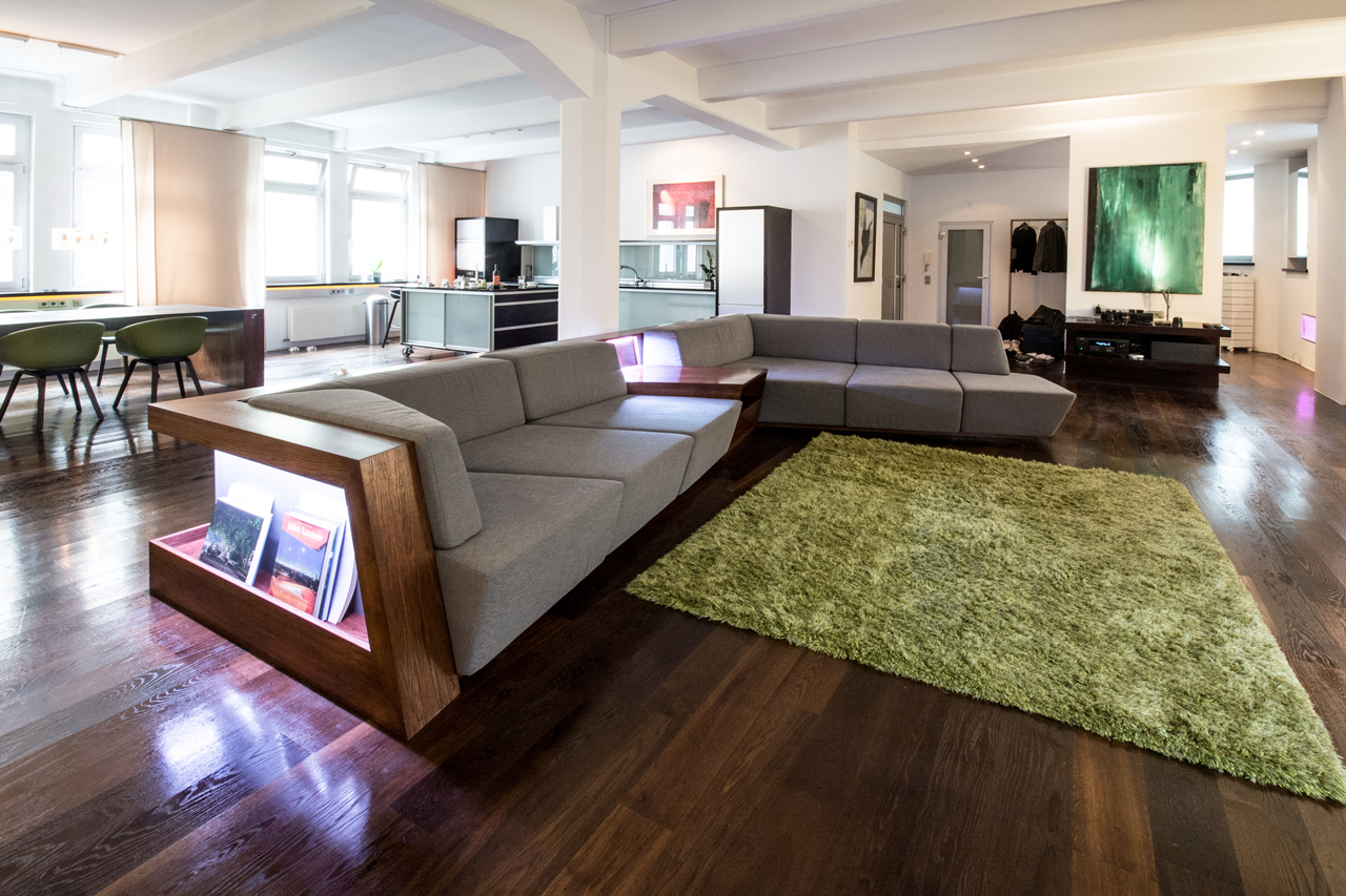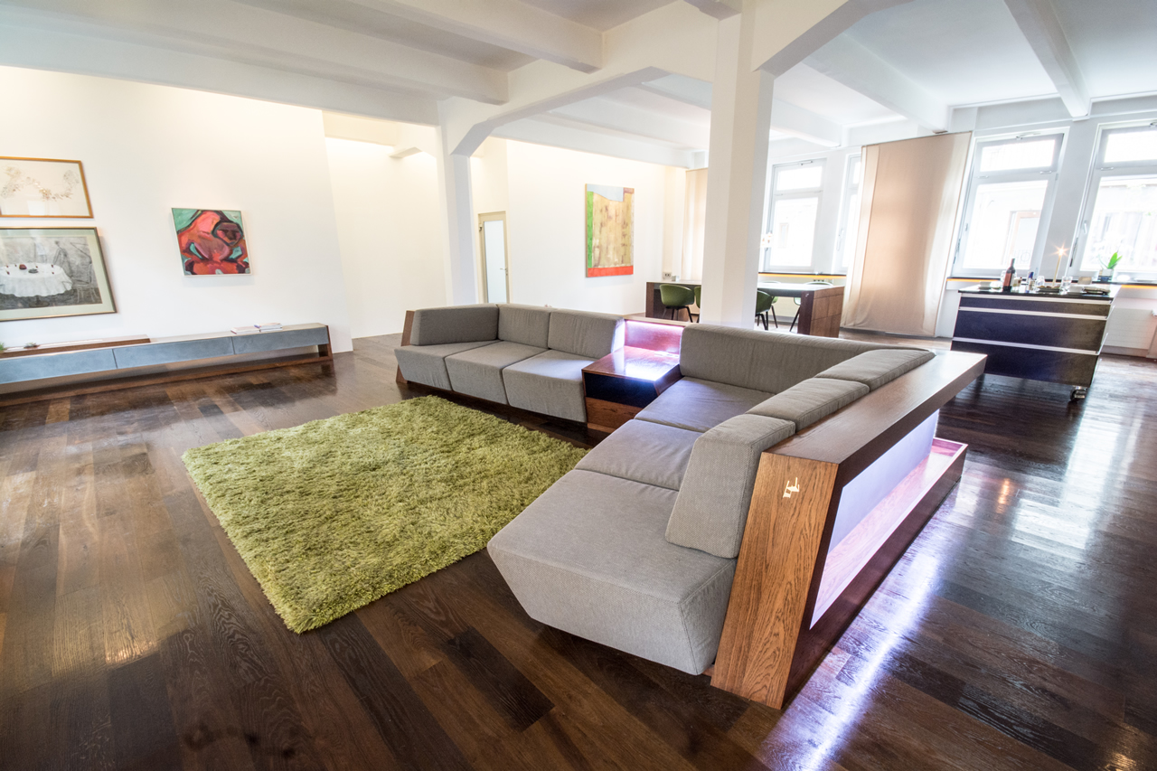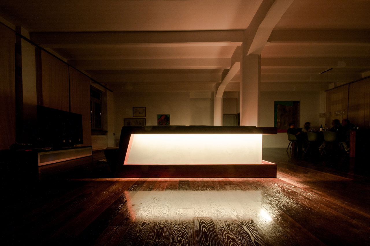 The couch, never ending space, designed for ultimative comfort. The material mix of high performance concrete, natural wood, stainless steel and a custom made fabric gives the design its well balanced impression.