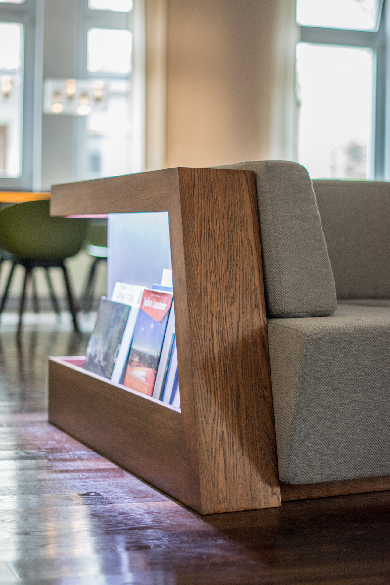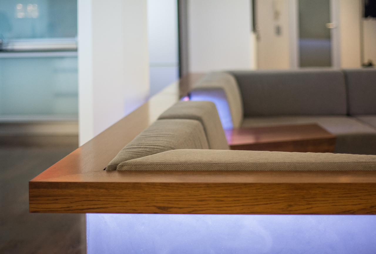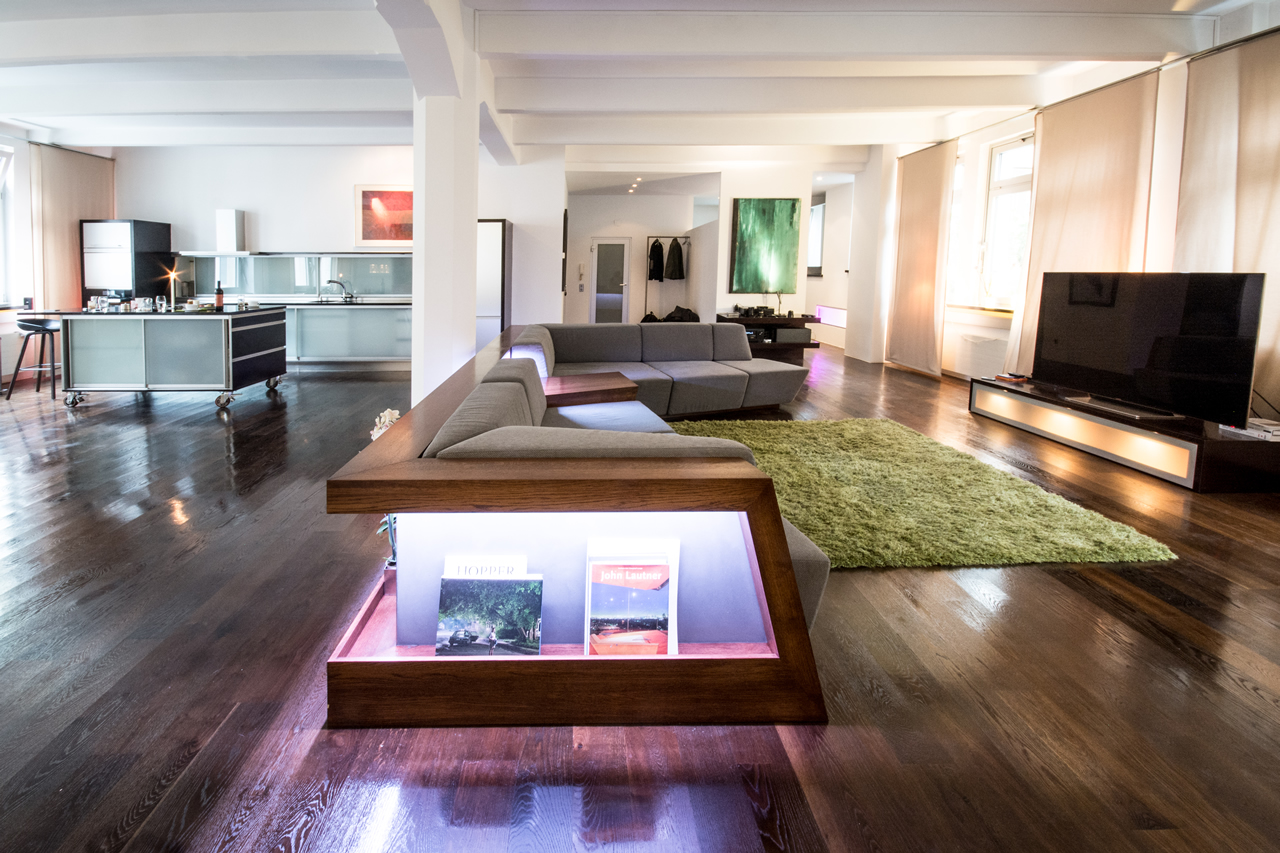 Another important element is the side table which divides the couch into two areas, the bed area and the lounge area. At the side table is the light switch, the RGB-LED light system und a double USB-port for additional mobile charge.