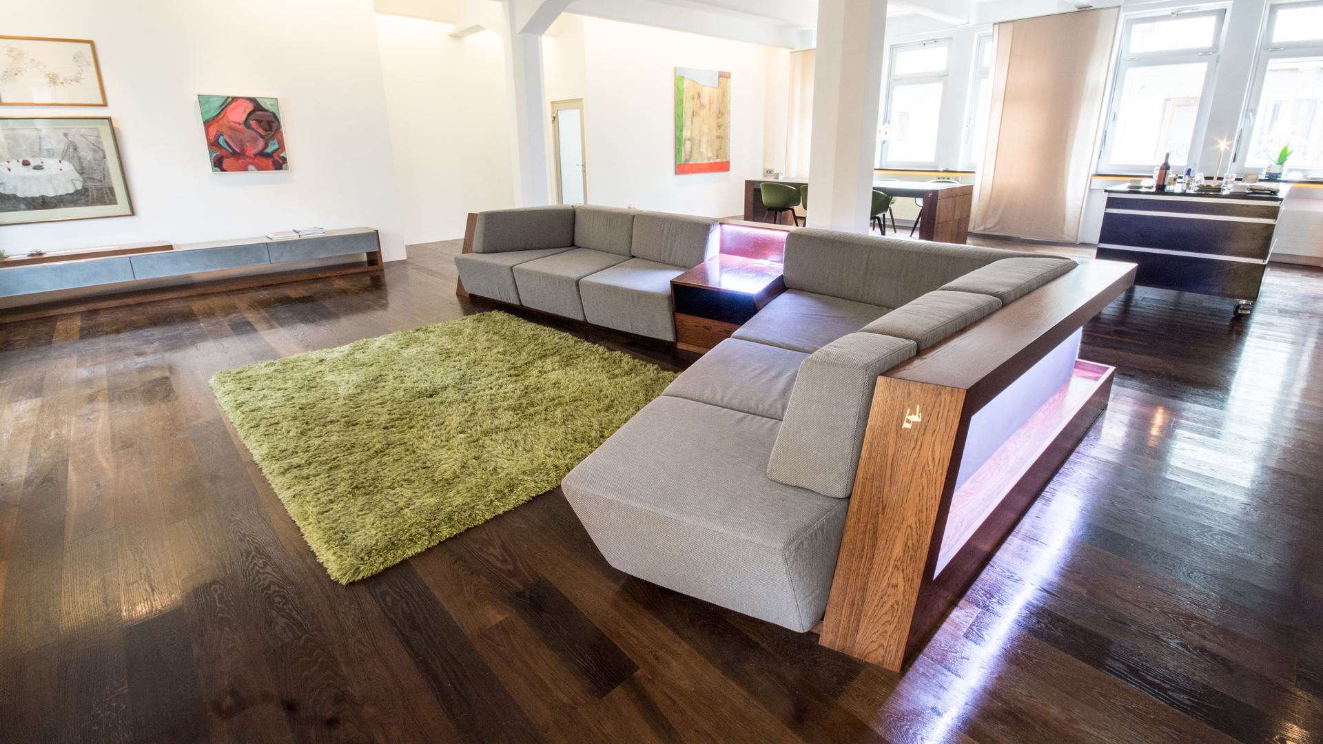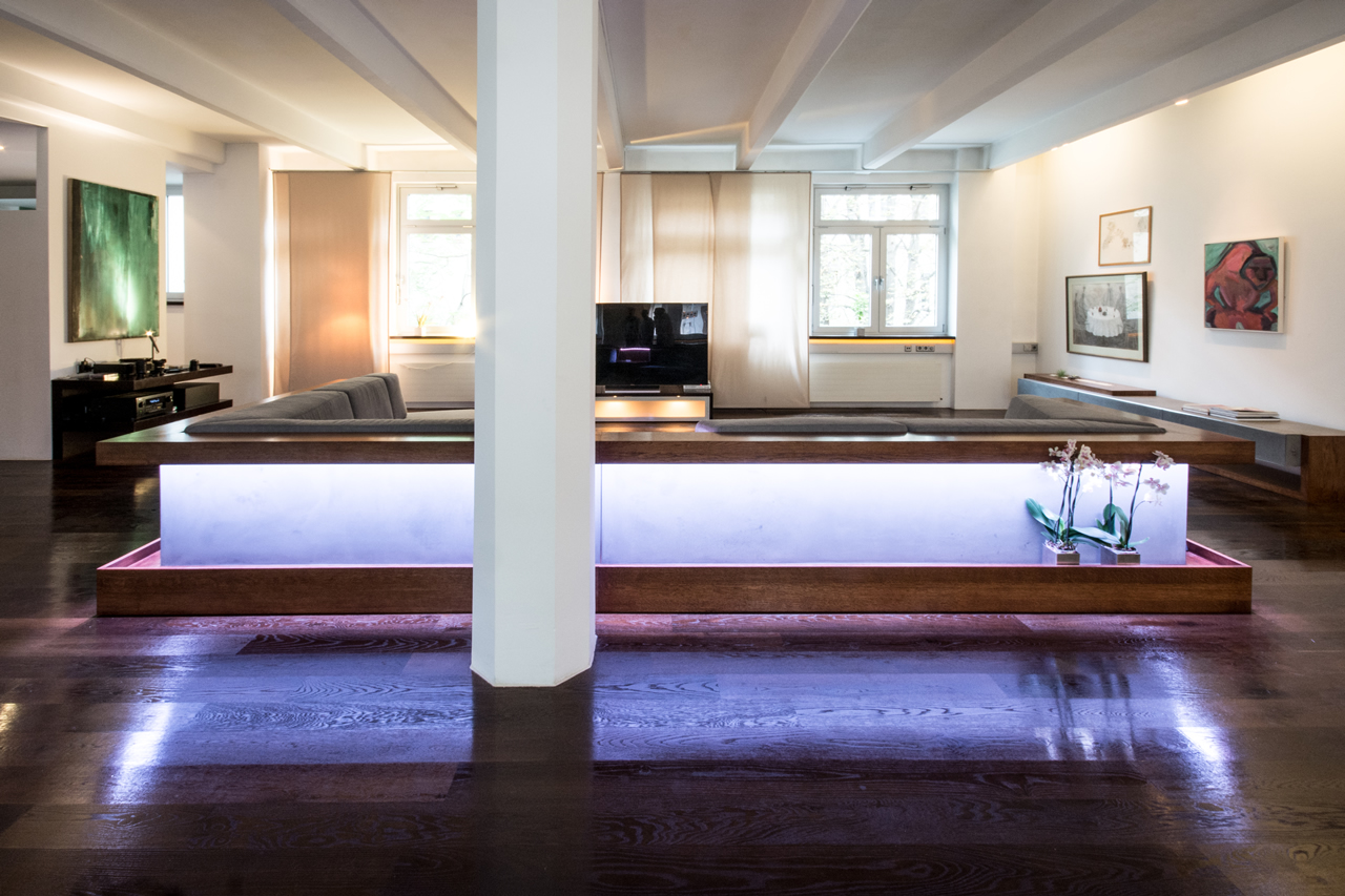 The couch is 4.80 by 2.80 meters, surrounded by an LED light stripe, adjustable in full RGB color scheme.