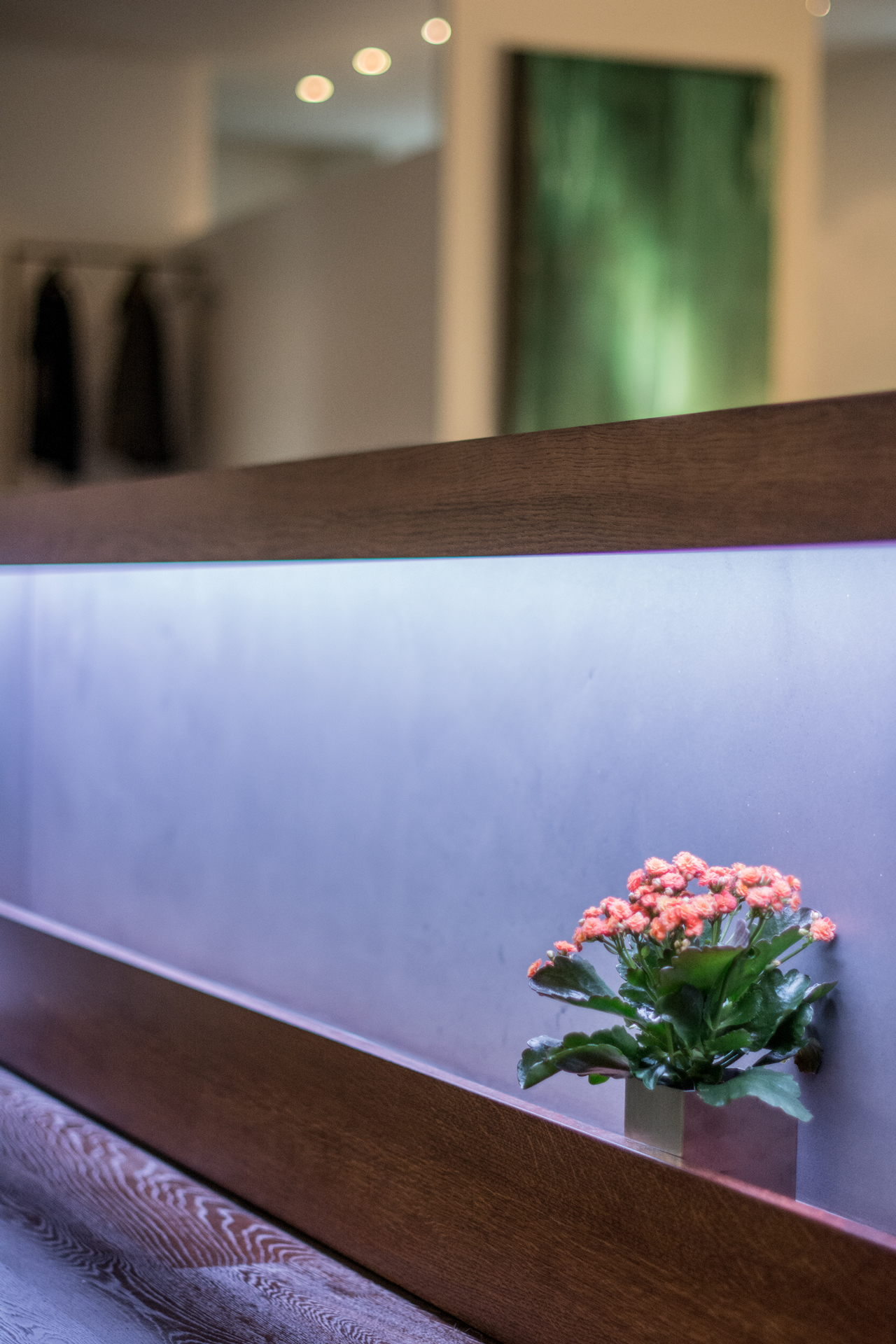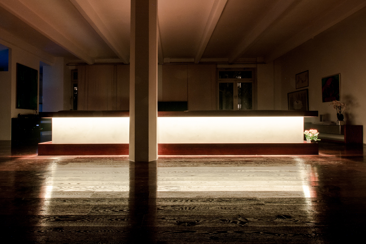 Light is the second major design element, next to the base materials. The light system is used for an internal presentation area for art and plants.