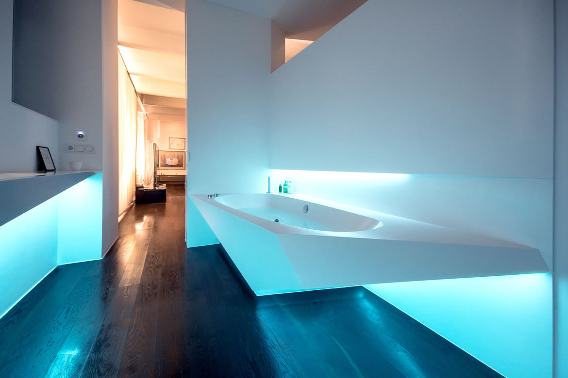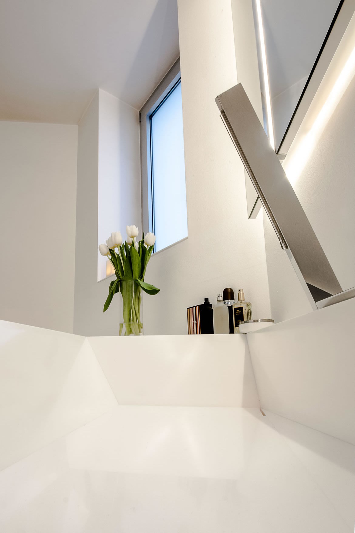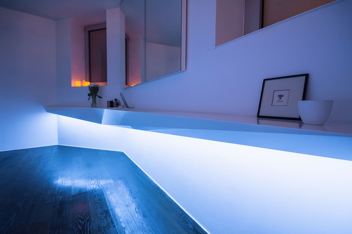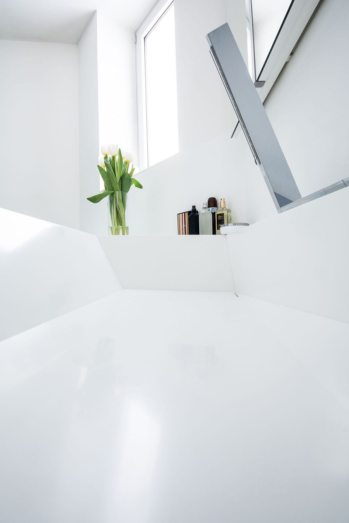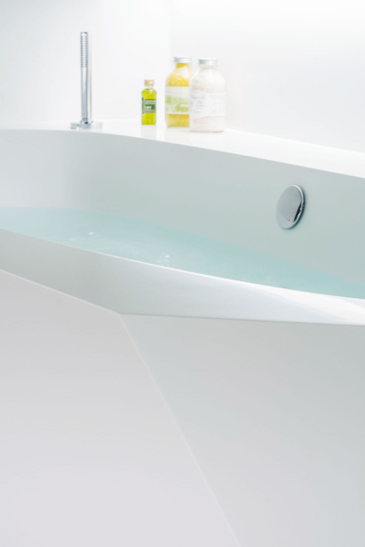 The low poly sink is produced seamless, completely carried on a wall, indirectly illuminated with a full RGB-LED color range. So this sink became a wall light element as well. The touch based fitting is a hansalatrava and was selected in the early design process. The bathtub is floating and indirectly illuminated. The entire structure was created with Dupont™ Corian® adding nicely to the aesthetic, and feel, of ice. The control of the bathtub is easy like a smartphone. Once you adjusted your personal settings, the fittings are memorizing these setup, easy like "press and bath". Therefor we took a viega system that can fill the tub from the bottom so you don´t hear a single drop falling. The backwall is designed as a multi functional tool. It´s an apothecary cabinet and a door. When you close the bath the apothecary cabinet offers everything a wellness heart desires