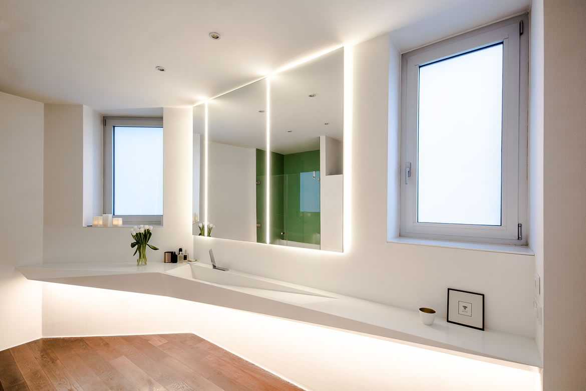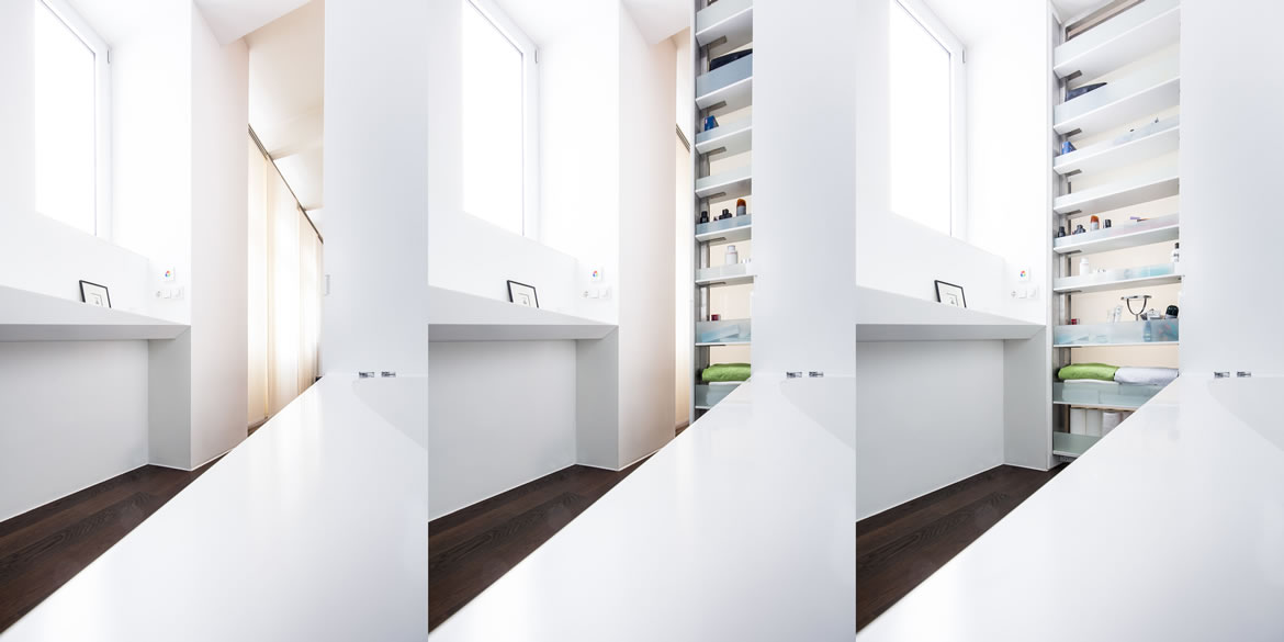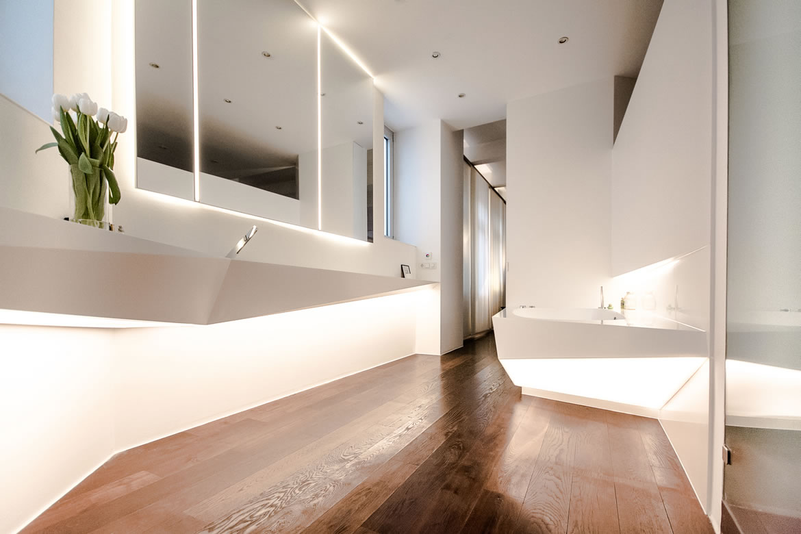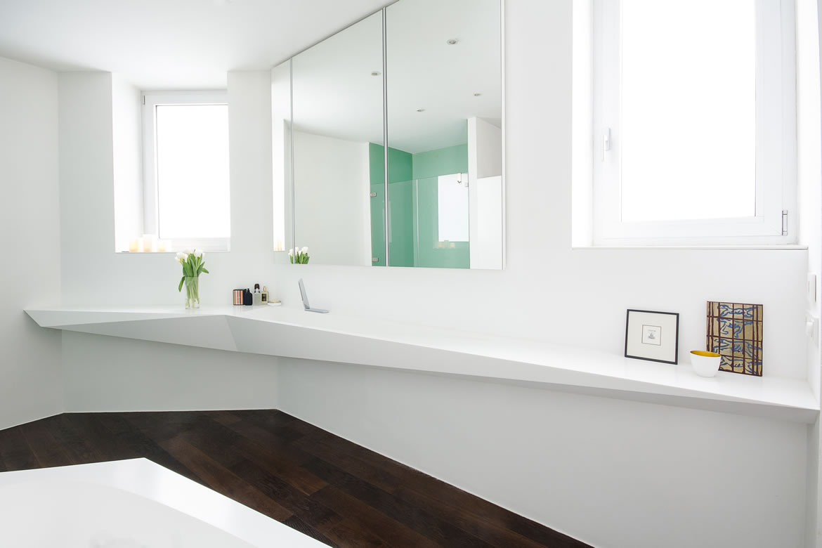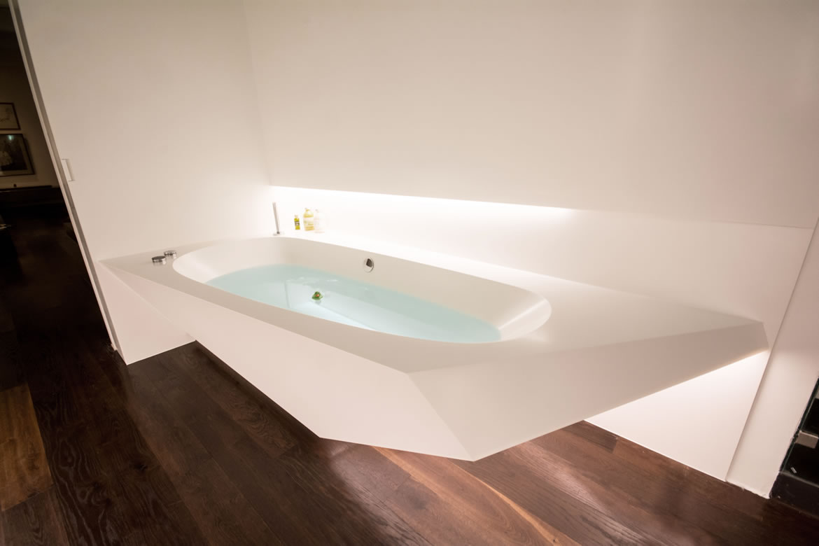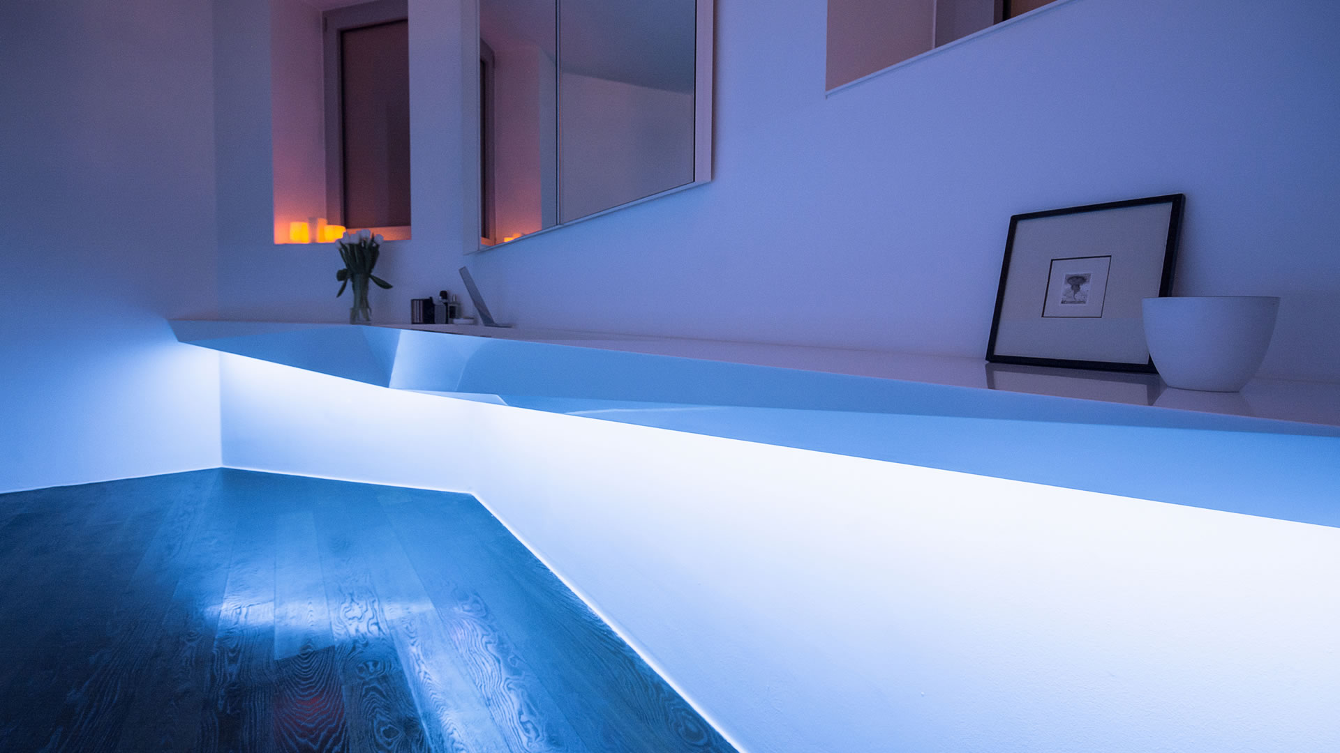The low poly sink is produced seamless, completely carried on a wall, indirectly illuminated with a full RGB-LED color range. So this sink became a wall light element as well. The touch based fitting is a hansalatrava and was selected in the early design process. The bathtub is floating and indirectly illuminated. The entire structure was created with Dupont™ Corian® adding nicely to the aesthetic, and feel, of ice. The control of the bathtub is easy like a smartphone. Once you adjusted your personal settings, the fittings are memorizing these setup, easy like "press and bath". Therefor we took a viega system that can fill the tub from the bottom so you don´t hear a single drop falling. The backwall is designed as a multi functional tool. It´s an apothecary cabinet and a door. When you close the bath the apothecary cabinet offers everything a wellness heart desires