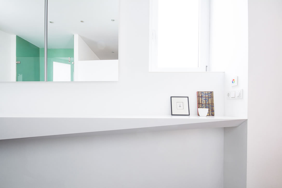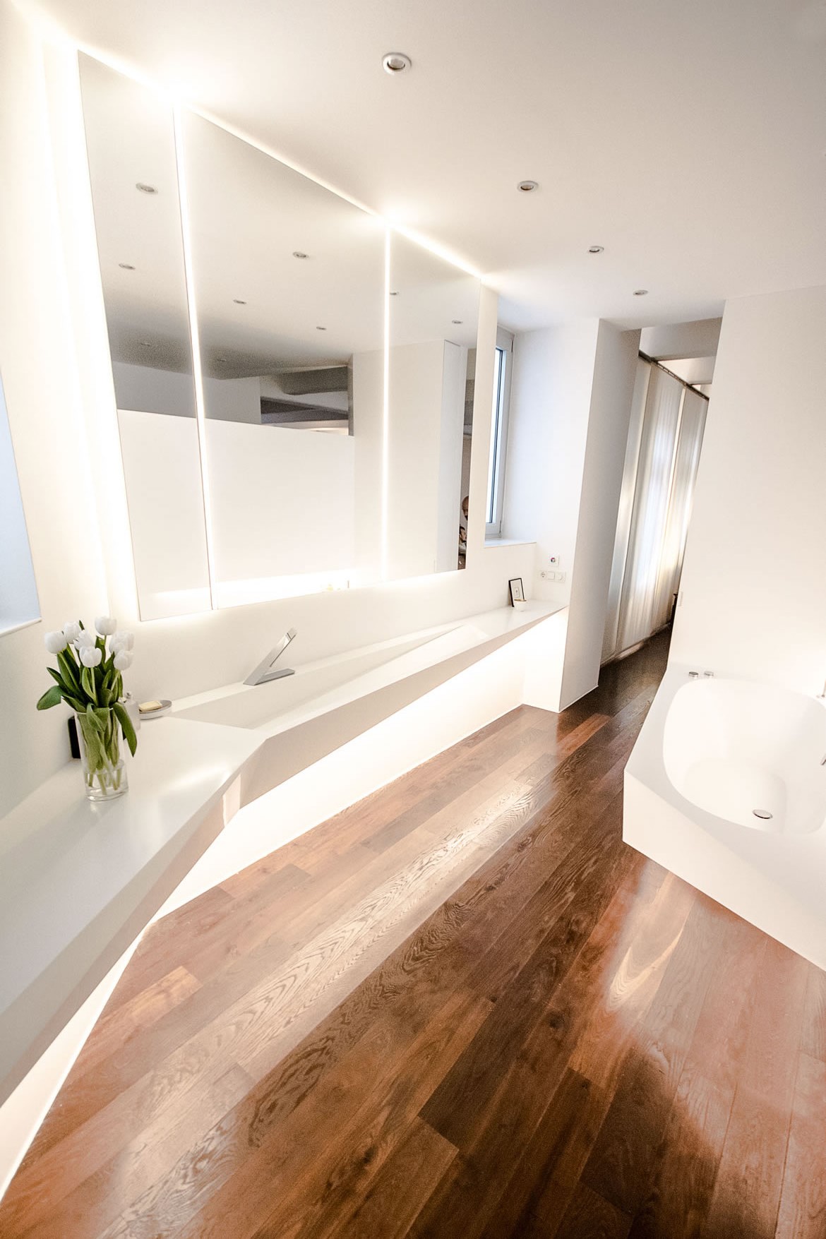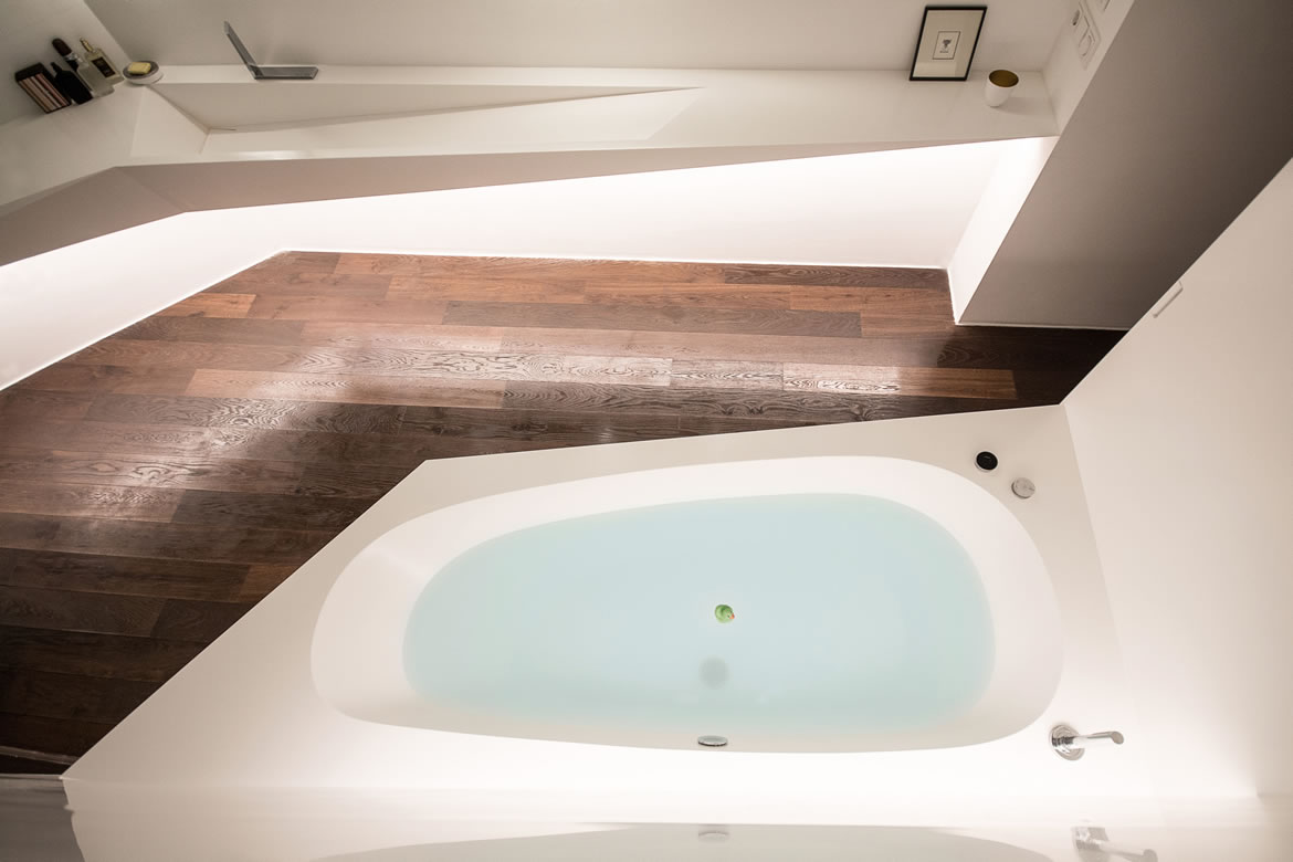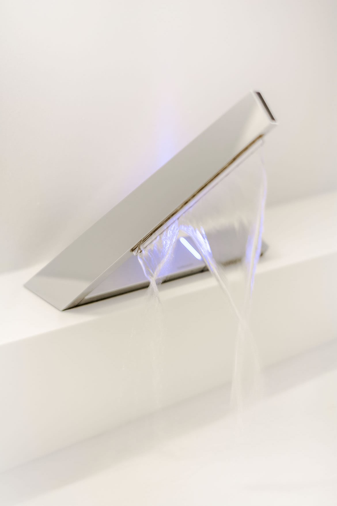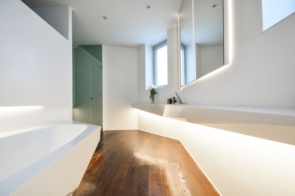 The low poly sink is produced seamless, completely carried on a wall, indirectly illuminated with a full RGB-LED color range. So this sink became a wall light element as well. The touch based fitting is a hansalatrava and was selected in the early design process. The bathtub is floating and indirectly illuminated. The entire structure was created with Dupont™ Corian® adding nicely to the aesthetic, and feel, of ice. The control of the bathtub is easy like a smartphone. Once you adjusted your personal settings, the fittings are memorizing these setup, easy like "press and bath". Therefor we took a viega system that can fill the tub from the bottom so you don´t hear a single drop falling. The backwall is designed as a multi functional tool. It´s an apothecary cabinet and a door. When you close the bath the apothecary cabinet offers everything a wellness heart desires