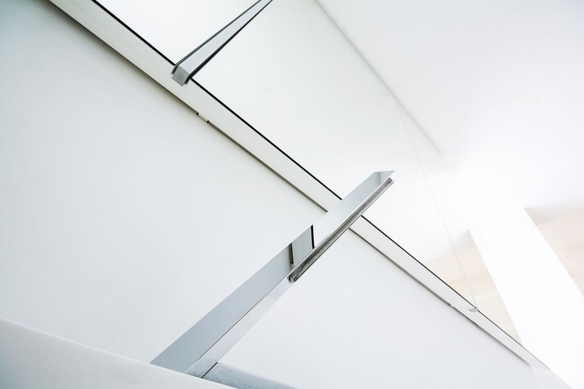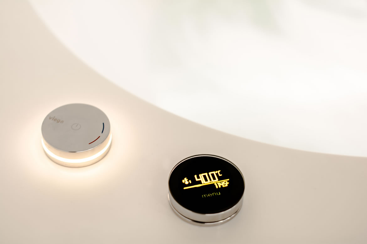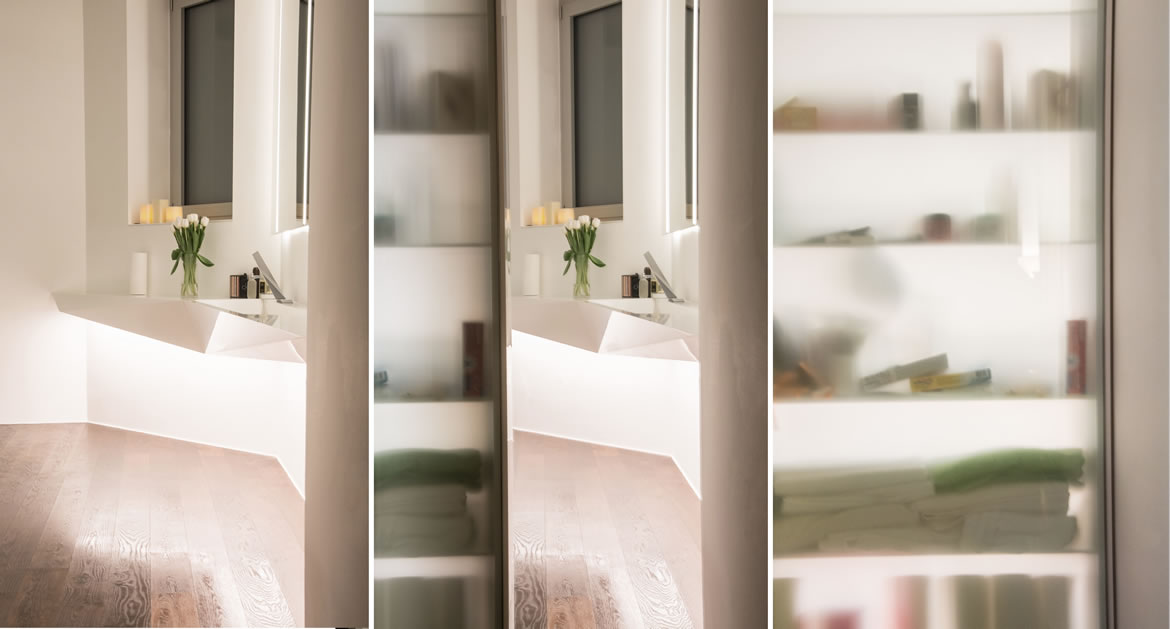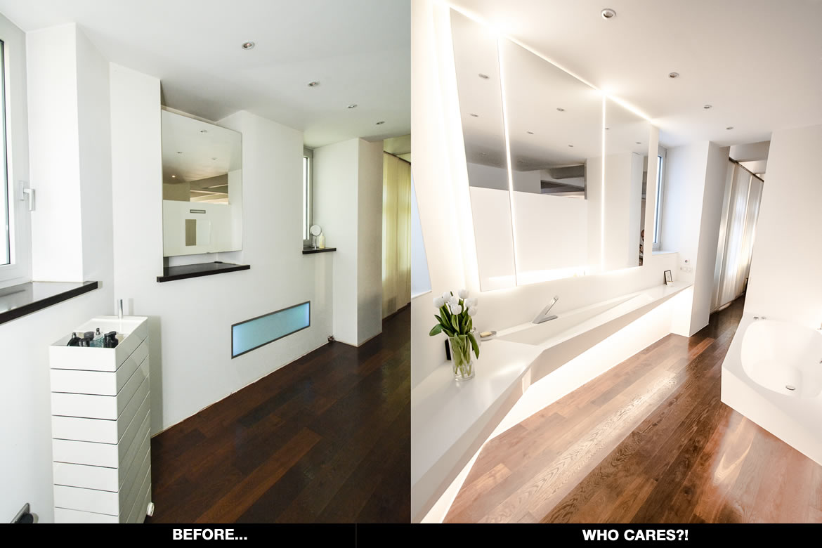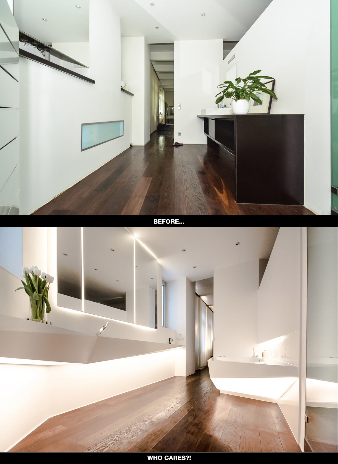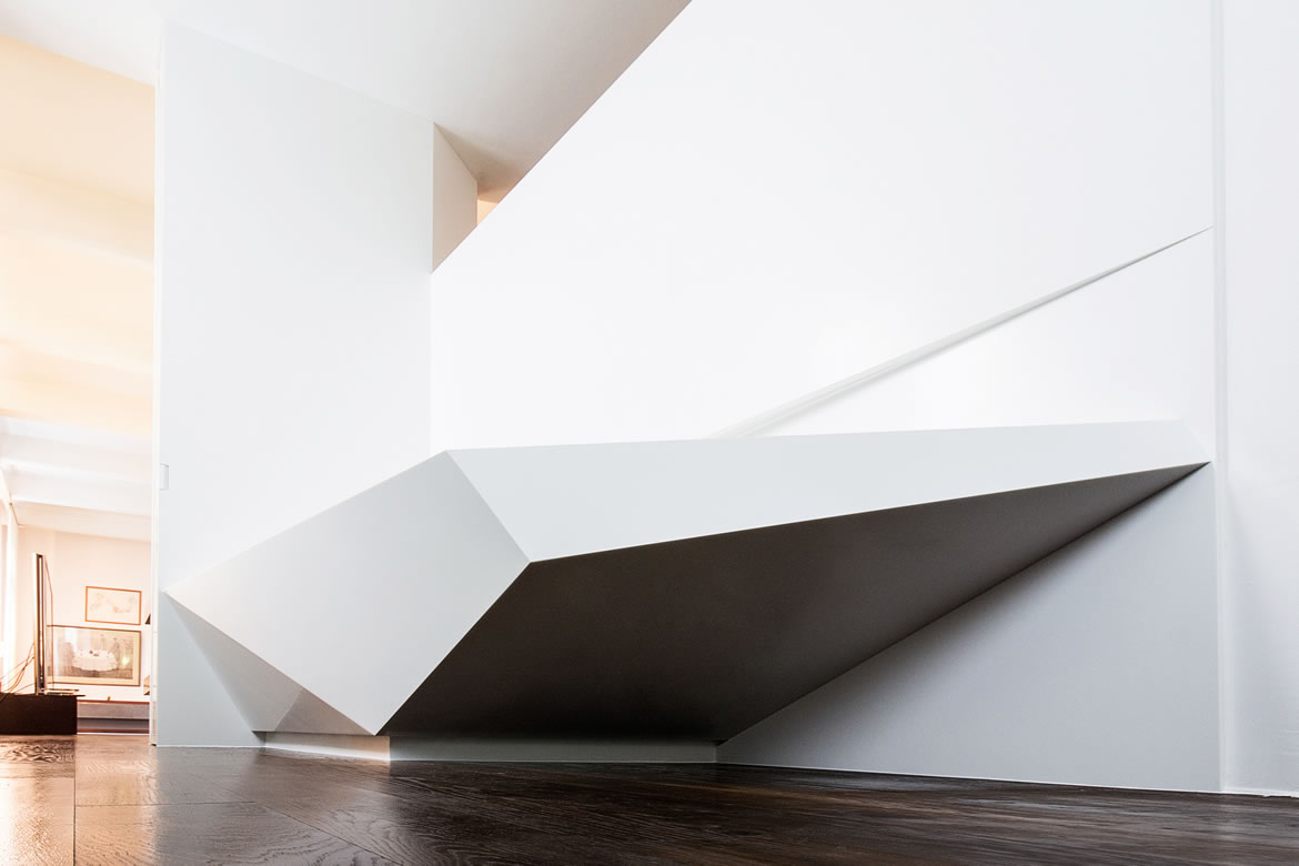The low poly sink is produced seamless, completely carried on a wall, indirectly illuminated with a full RGB-LED color range. So this sink became a wall light element as well. The touch based fitting is a hansalatrava and was selected in the early design process. The bathtub is floating and indirectly illuminated. The entire structure was created with Dupont™ Corian® adding nicely to the aesthetic, and feel, of ice. The control of the bathtub is easy like a smartphone. Once you adjusted your personal settings, the fittings are memorizing these setup, easy like "press and bath". Therefor we took a viega system that can fill the tub from the bottom so you don´t hear a single drop falling. The backwall is designed as a multi functional tool. It´s an apothecary cabinet and a door. When you close the bath the apothecary cabinet offers everything a wellness heart desires
